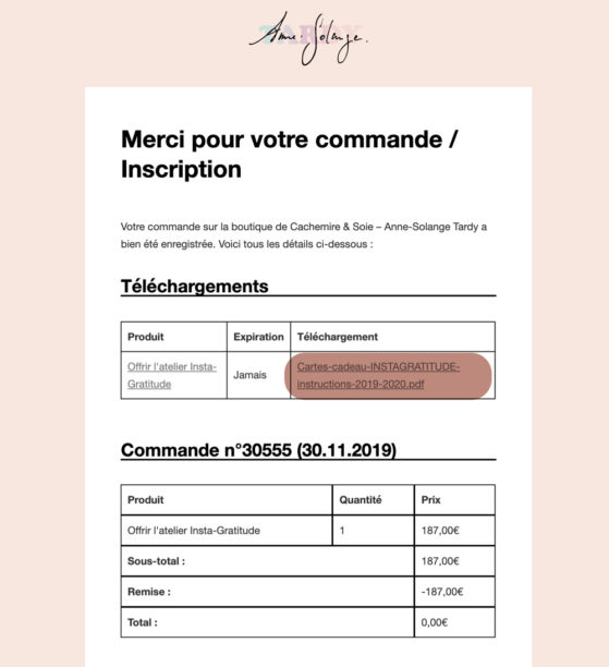 Vous allez recevoir un mail dans quelques instants, contenant le récapitulatif de votre commande. Celui-ci contient des instructions importantes :